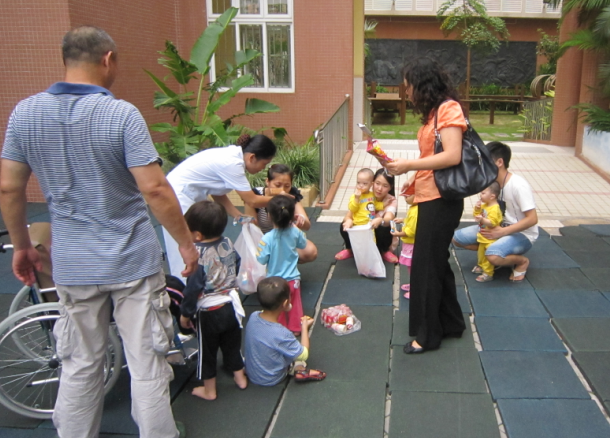 隨后,黃老師帶我們參觀了陽光幼兒園。小朋友正好在上戶外活動課,運動場上大概有10多個孩子,他們有的在玩蕩秋千,有的玩滑梯,有的在玩游戲,顯得十分開心……旁邊有一位男老師和女老師還有一位保育員在陪護,還有一位大伯,是一名熱心的義工,在看護一位坐在輪椅上的腦癱兒童。孩子們看到我們來了,十分開心也很懂禮貌,紛紛叫道:“阿姨好!”我們也把手上帶來的糖果、餅干等分發給他們。看到這些孩子們,我們的問題一下多了起來,黃老師一一為我們做了解答,她介紹:“這些孩子有的是嚴重的地中海貧血癥、有的是先天性心臟病、有的是唐氏綜合癥,他們從小被父母遺棄,由福利院撫養長大。目前,幼兒園最小的孩子才10多天大,所以保育員們都需要24小時值班,晚上起來為孩子們沖奶粉、換尿布。醫院也配置了醫務室,為孩子們做康復治療。幼兒園也會定期帶孩子們到戶外活動,比如10月份將組織去海濱公園……”